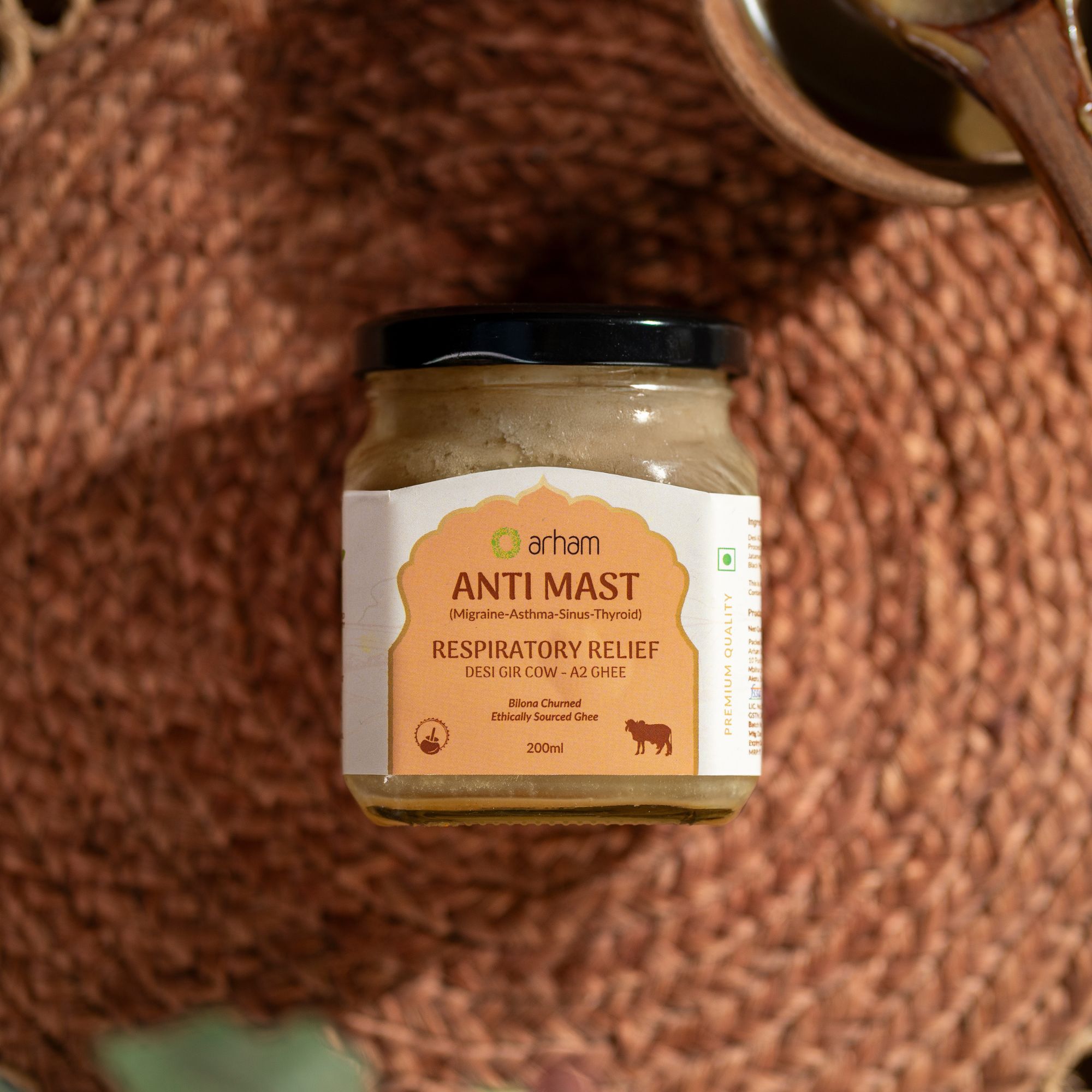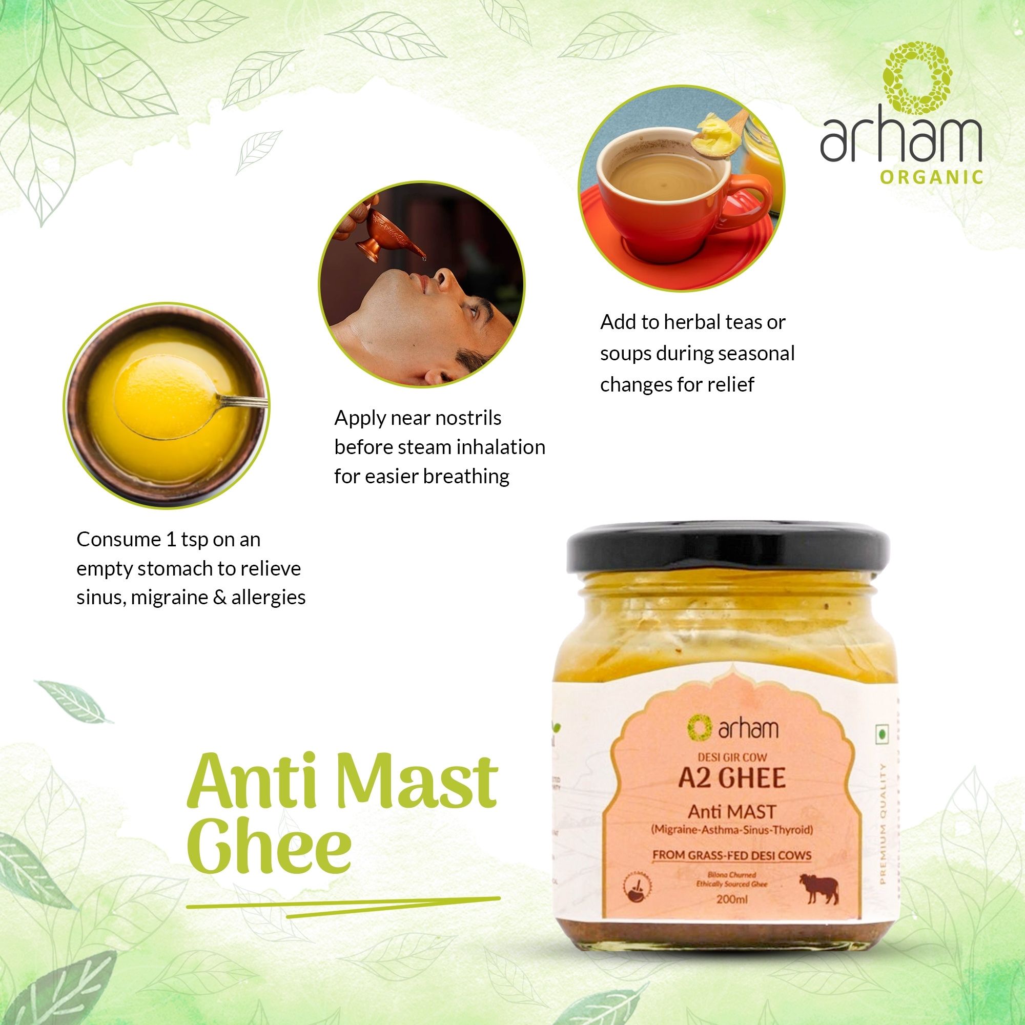 Experience the goodness of Arham Organic Anti Mast Ghee, crafted using the traditional Bilona method from A2 Gir Cow Ghee and infused with a unique blend of ginger, cinnamon, Jatamansi, and curcuma longa. This Ayurvedic formulation is designed to support respiratory health, migraine relief, thyroid balance, and overall well-being.