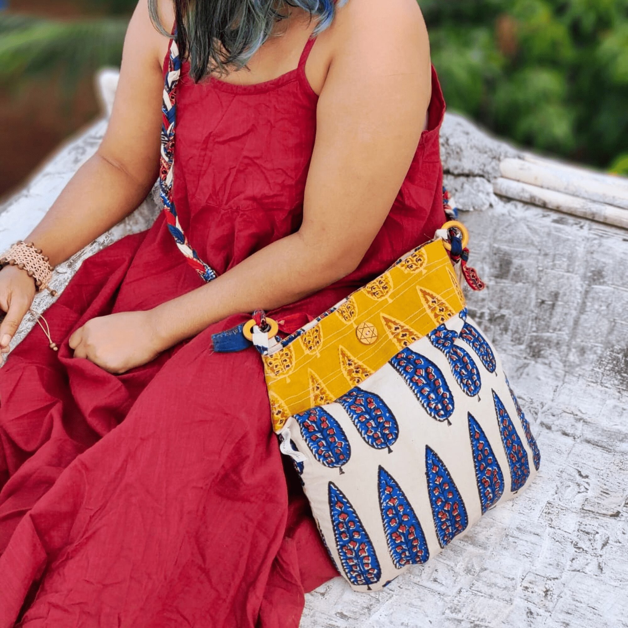 Almitra Sustainables Blue & Off-White Hand Block Printed Sling Bag is ethically handcrafted from natural cotton with eco-friendly dyes. Featuring vibrant indigo motifs, a mustard accent, and a durable braided strap, it’s a stylish, plastic-free essential for sustainable, everyday fashion.