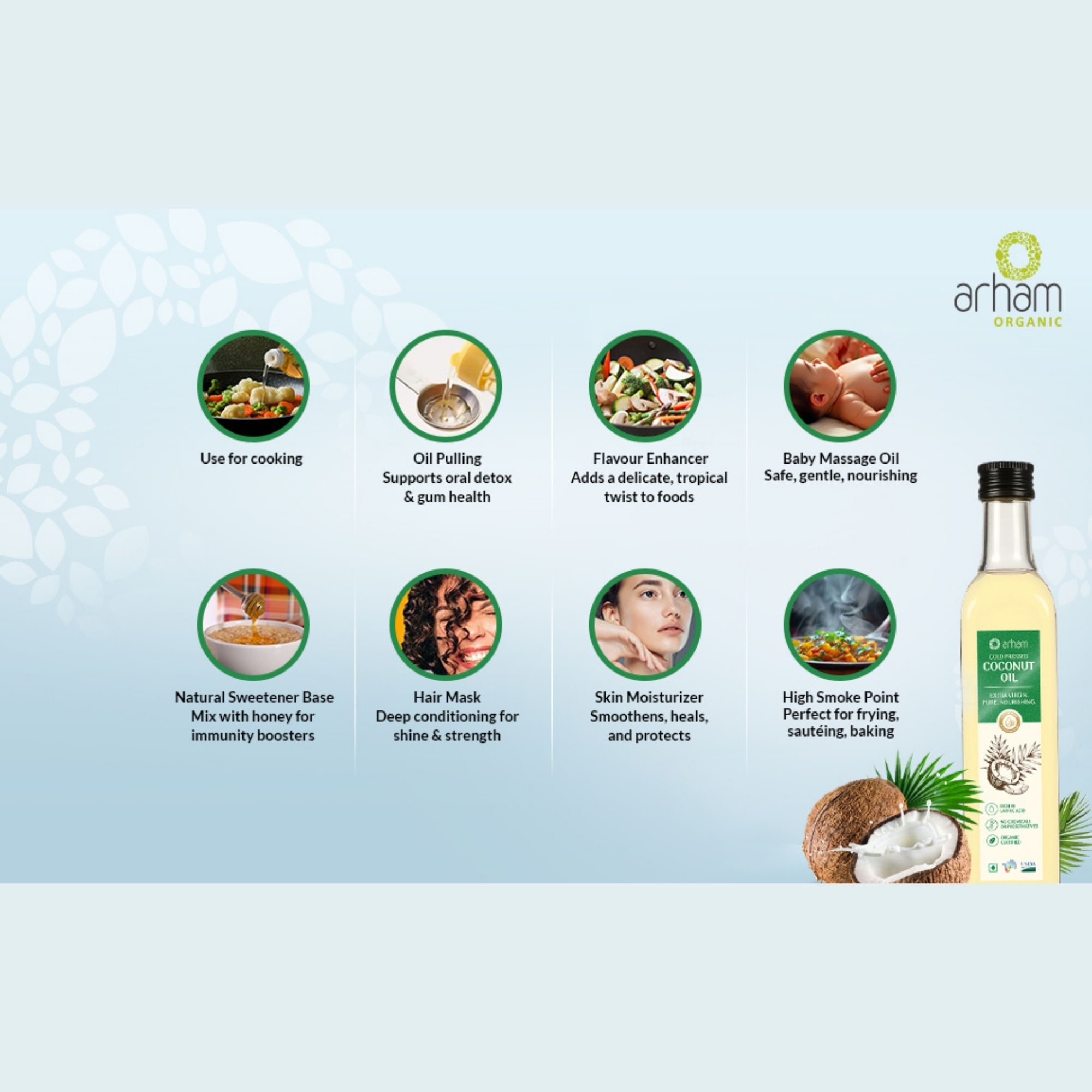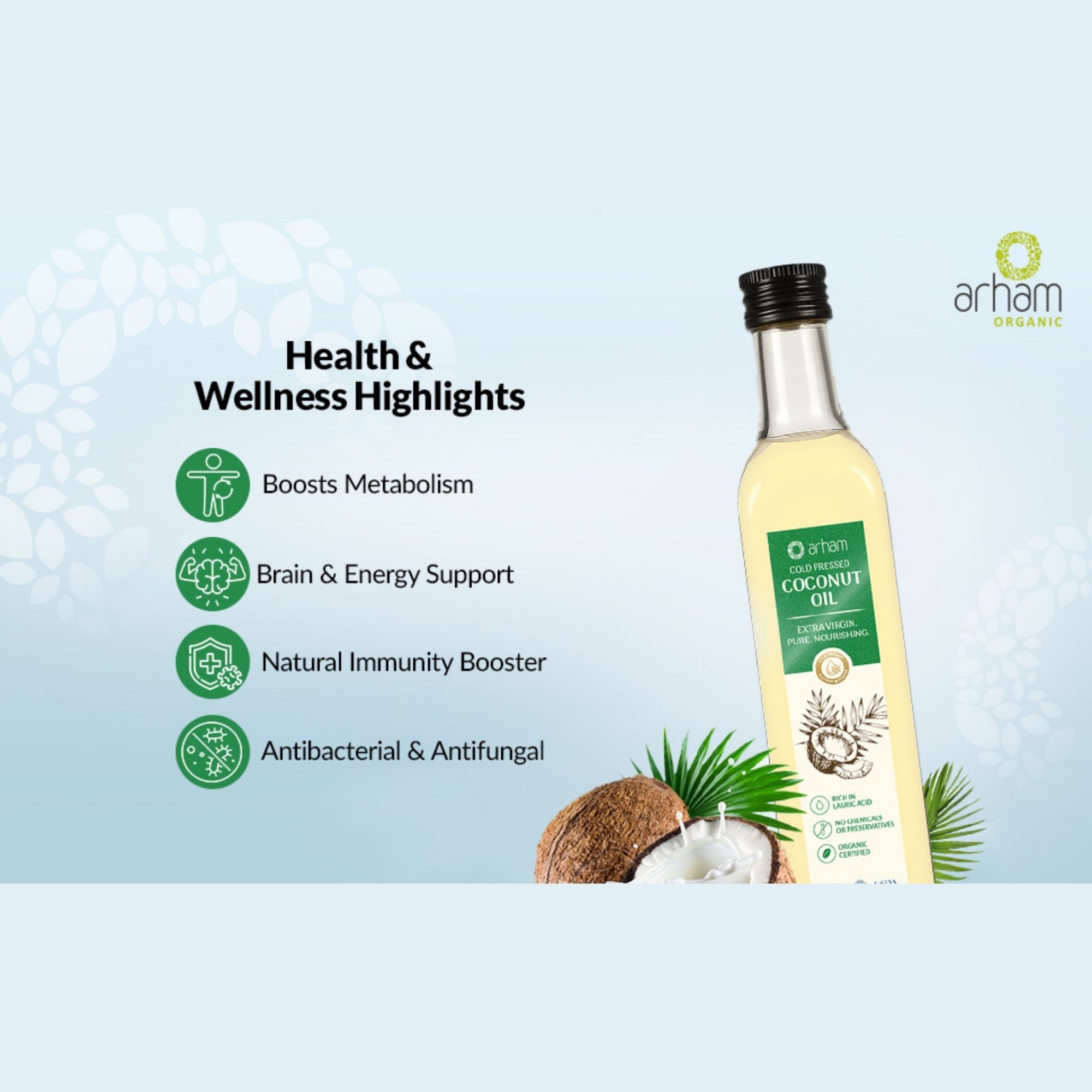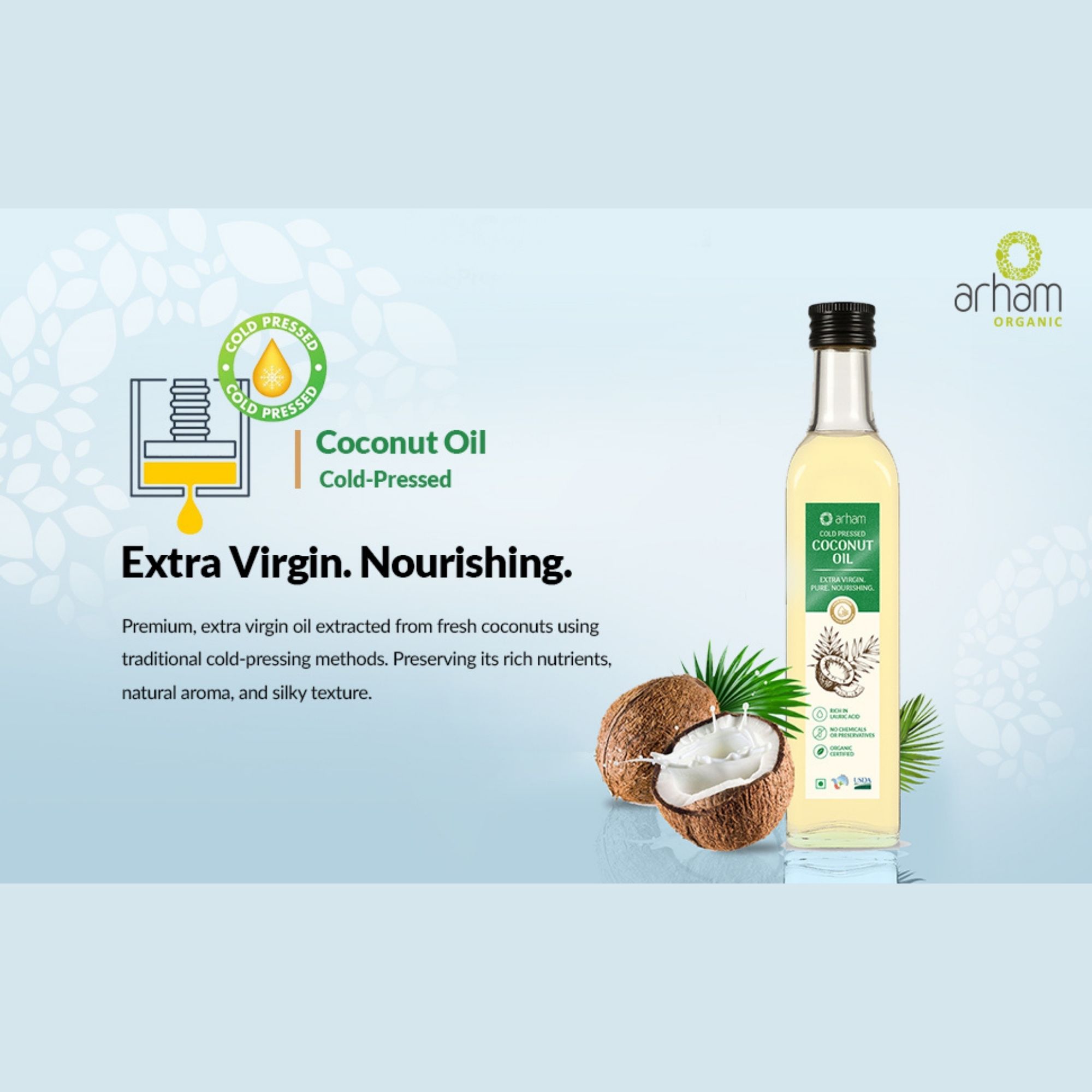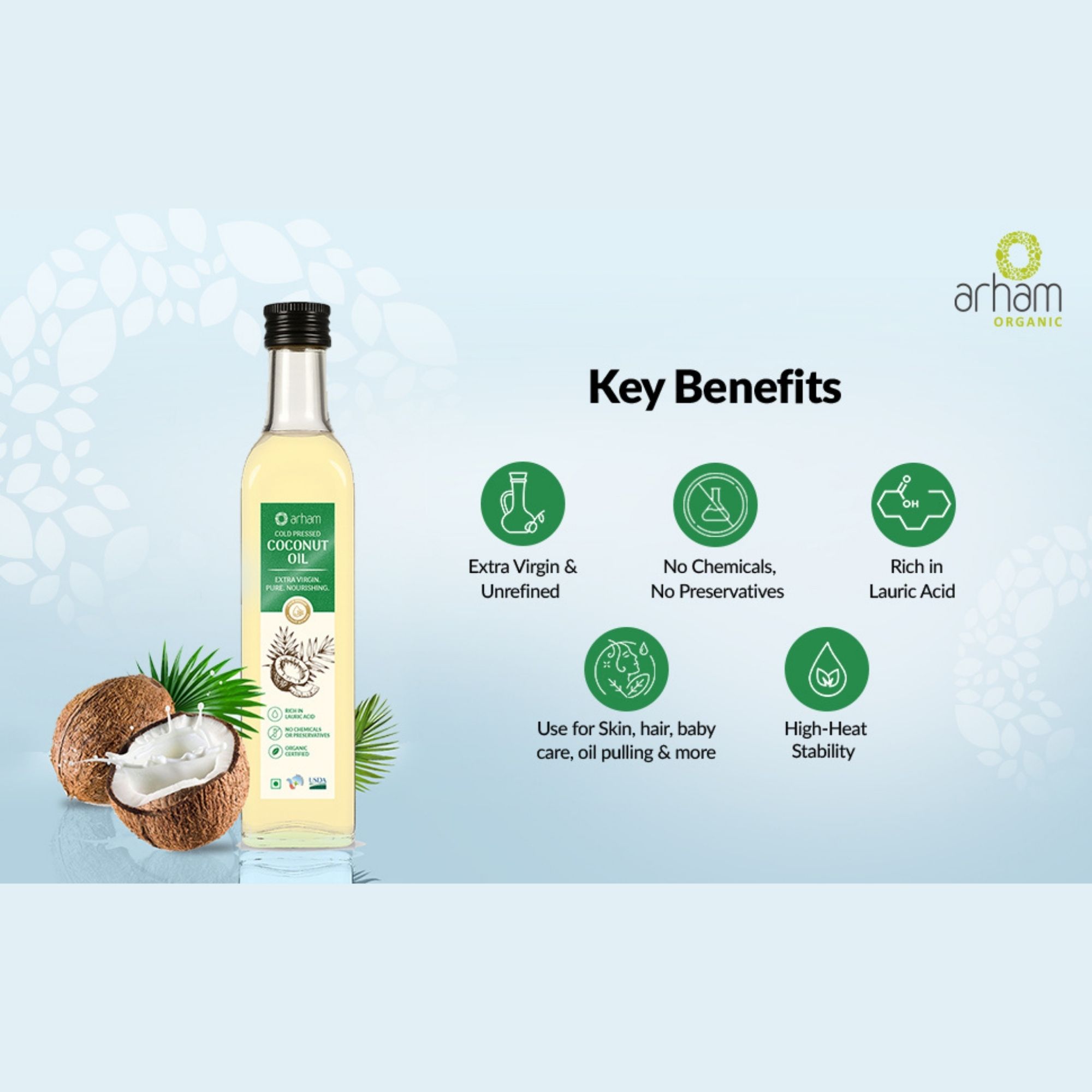 Experience the purity of Arham Organic Coconut Oil, crafted from the finest organic coconuts to deliver 100% natural nourishment for your hair, skin, and overall wellness. This pure virgin coconut oil is cold-pressed to retain essential nutrients, offering the best care.