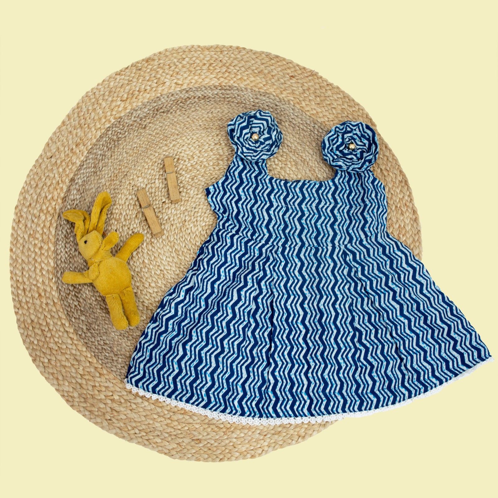 A soft, breathable cotton dress with an elegant indigo wave print, floral sleeve bows, and a back zipper for easy dressing. Chic, comfortable, and perfect for special occasions or playdates.