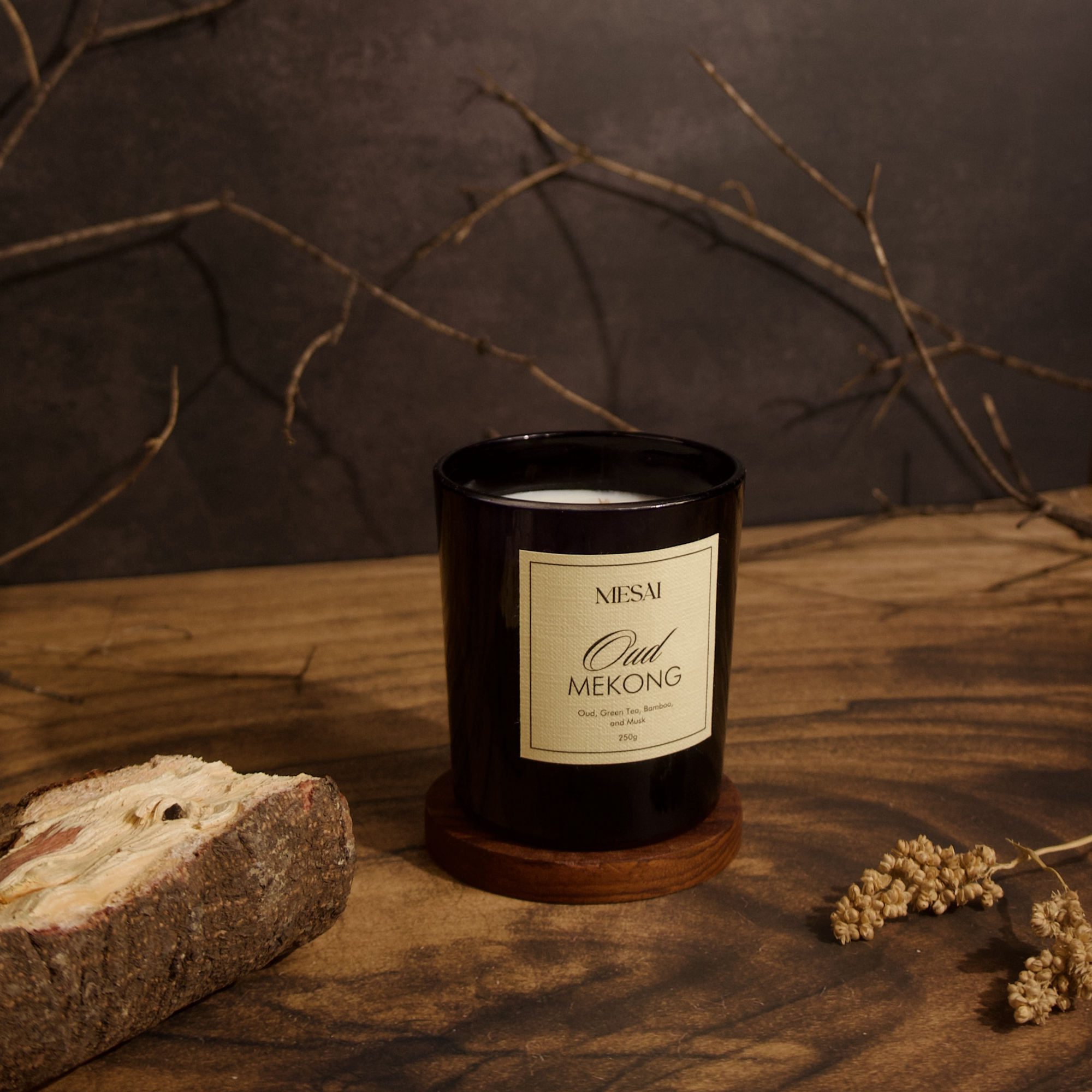 Oud Mekong candle blends oud, green tea, bamboo & musk for a refreshing yet grounding fragrance that inspires calm and balance.