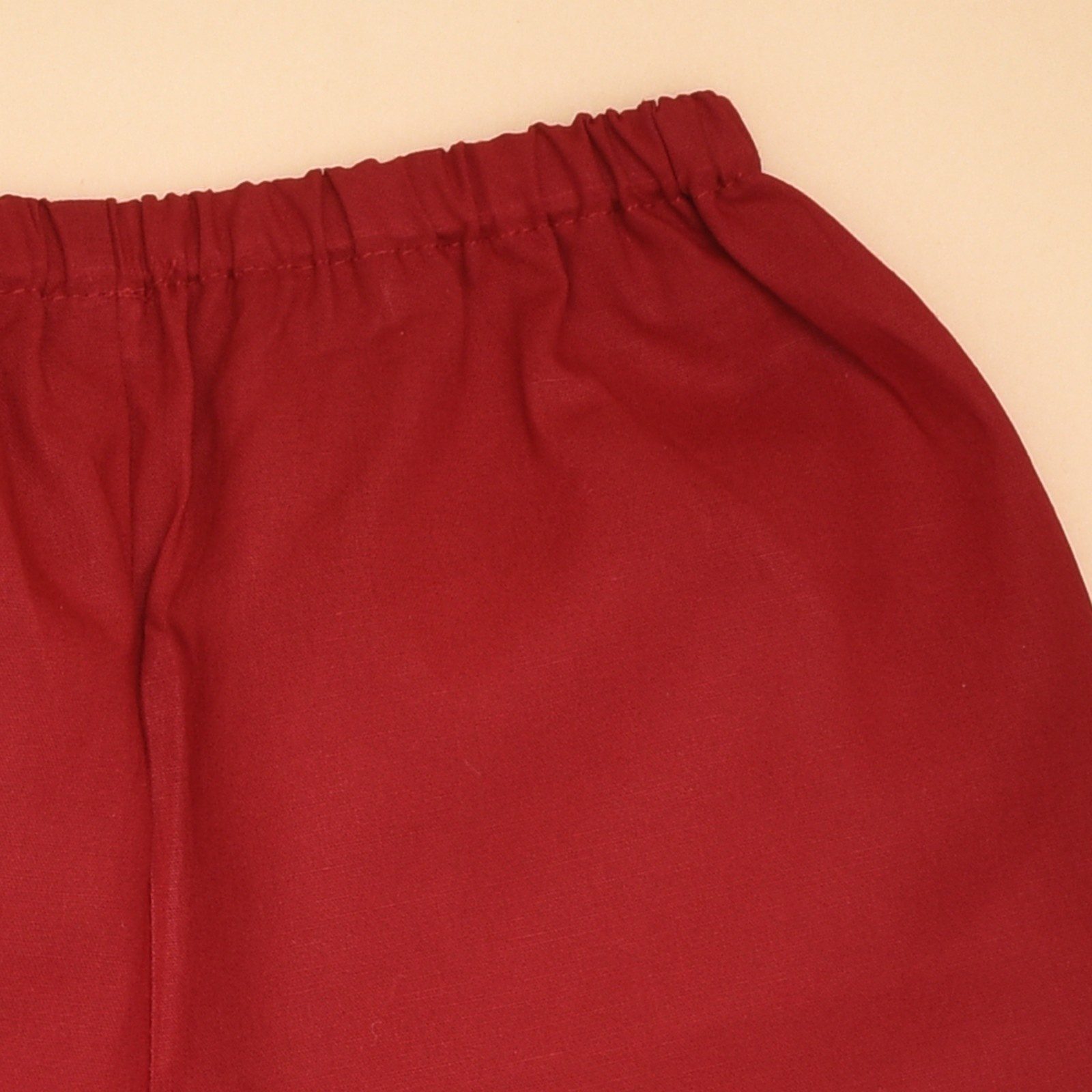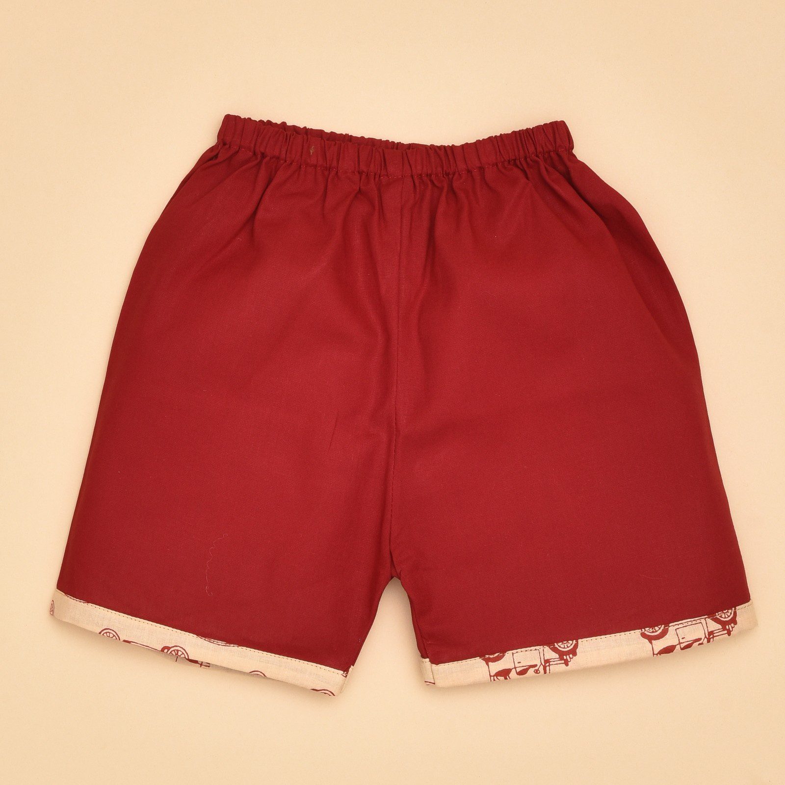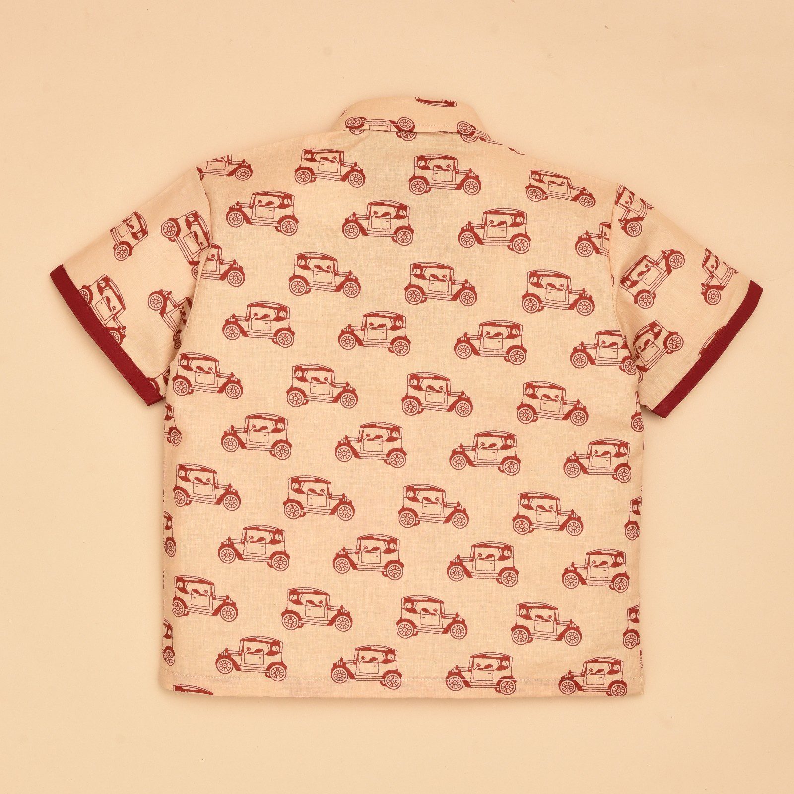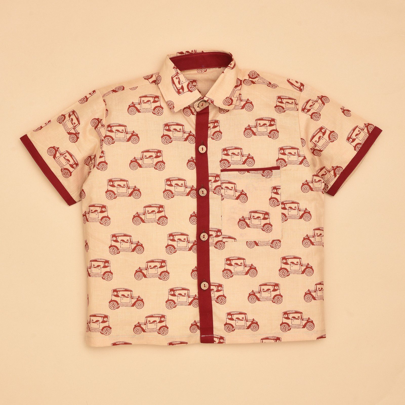 A comfortable pure cotton shirt-pant set featuring playful car prints on a beige shirt with maroon trim and matching maroon trousers. Soft, breathable, and perfect for everyday play or outings.