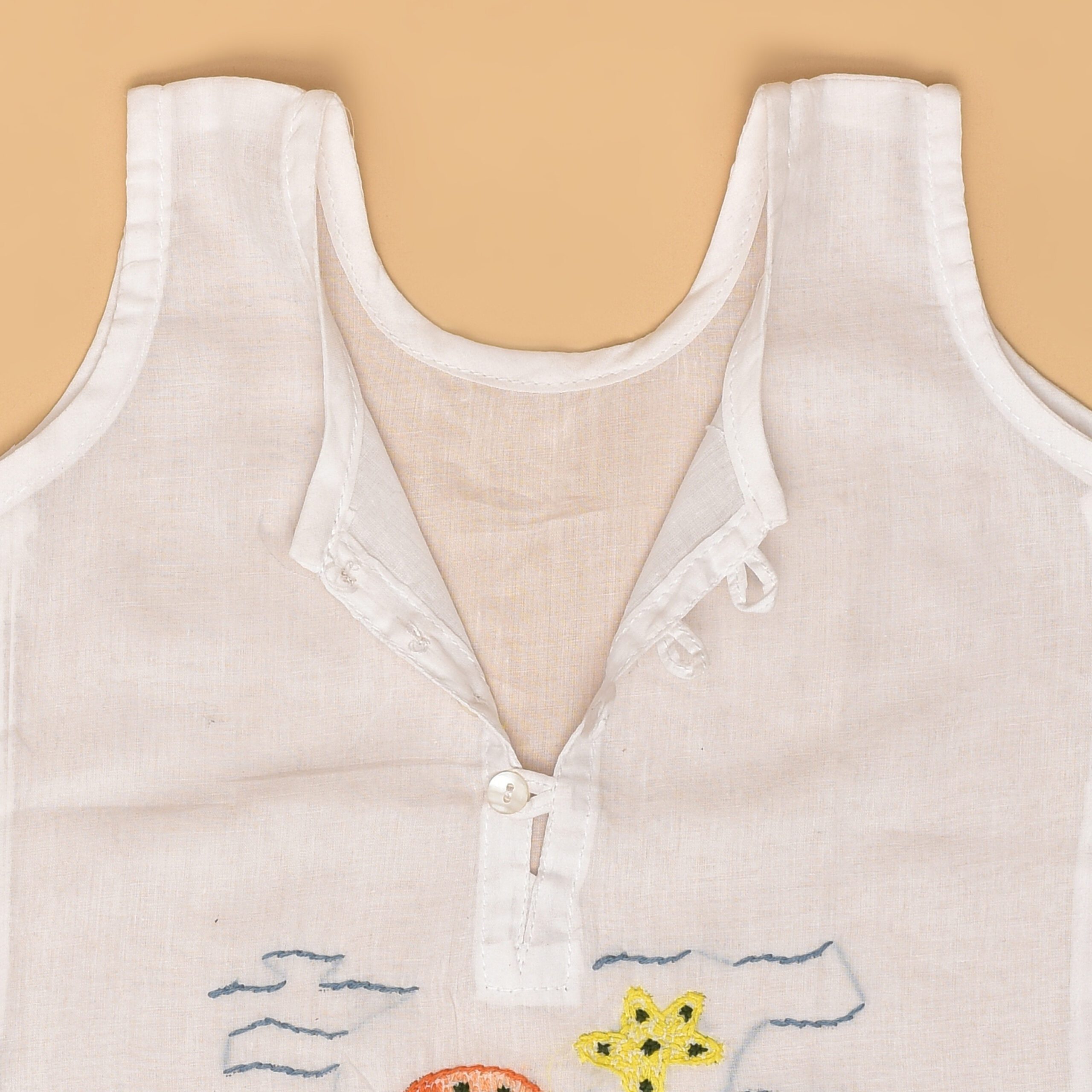 Shop NowWhite Mulmul Semi Front Open Jabla for Babies with Sea Creatures Design Hand Embroidery