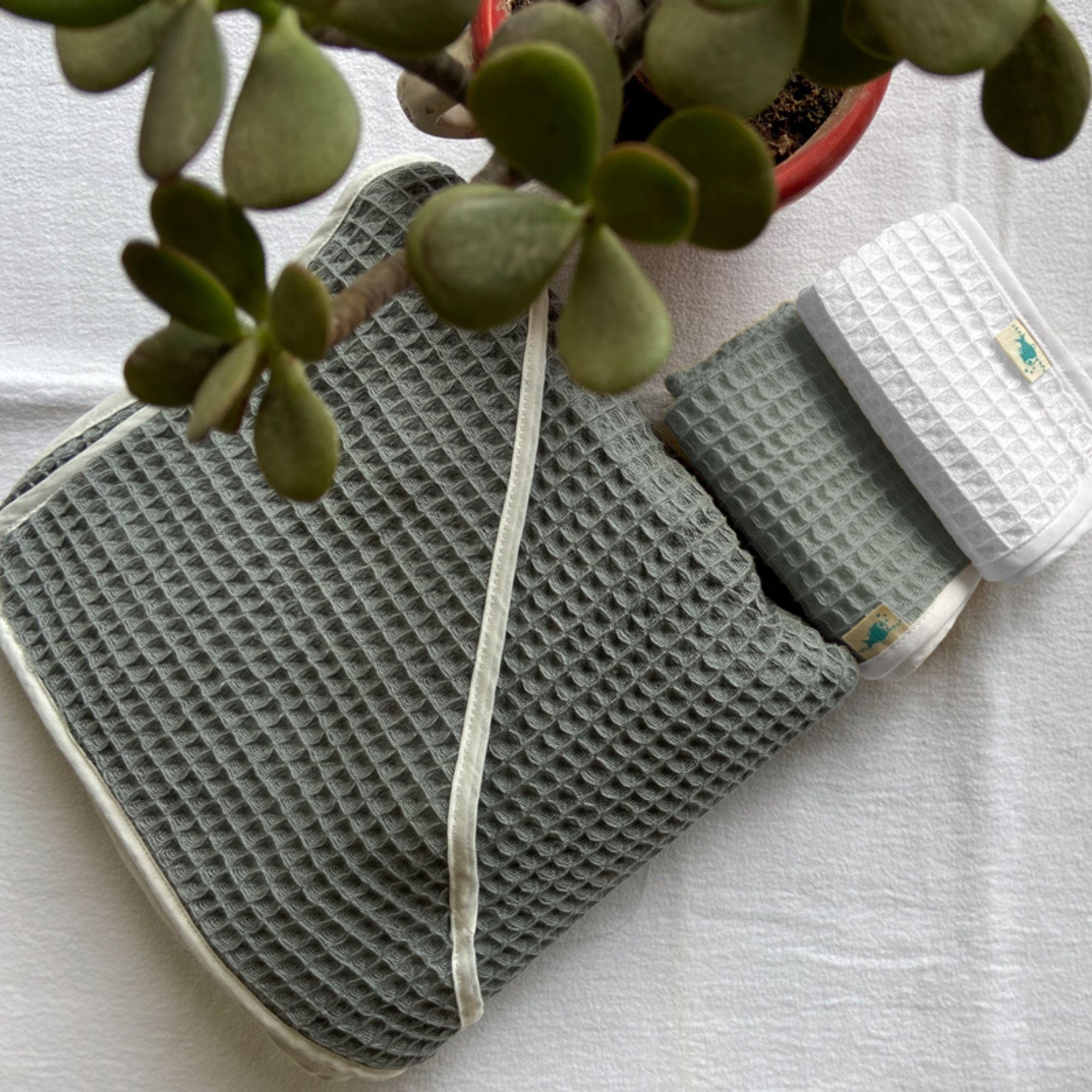 Set contains: 1 x Hooded Towel 2 x washcloths in assorted colours. Our limited-edition Azo free dyed Grey towel is 100% organic cotton. The handwoven waffle weave makes it more absorbent, softer and quicker to dry as compared to a regular plush towel. A gender-neutral gift, it comes packed in a reusable muslin bag.