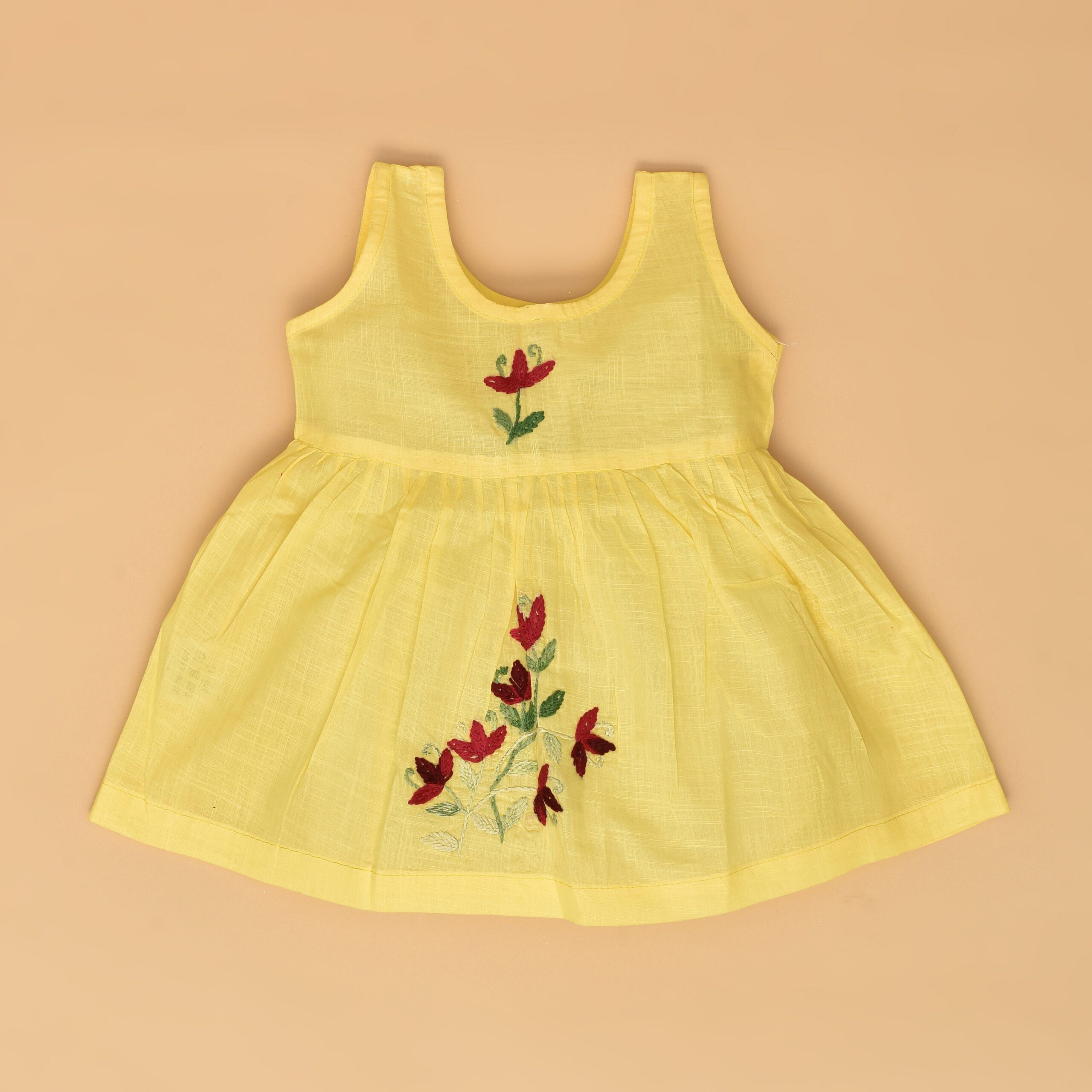 Shop NowYellow Cotton Baby Dress with Periwinkle Design Hand Embroidery