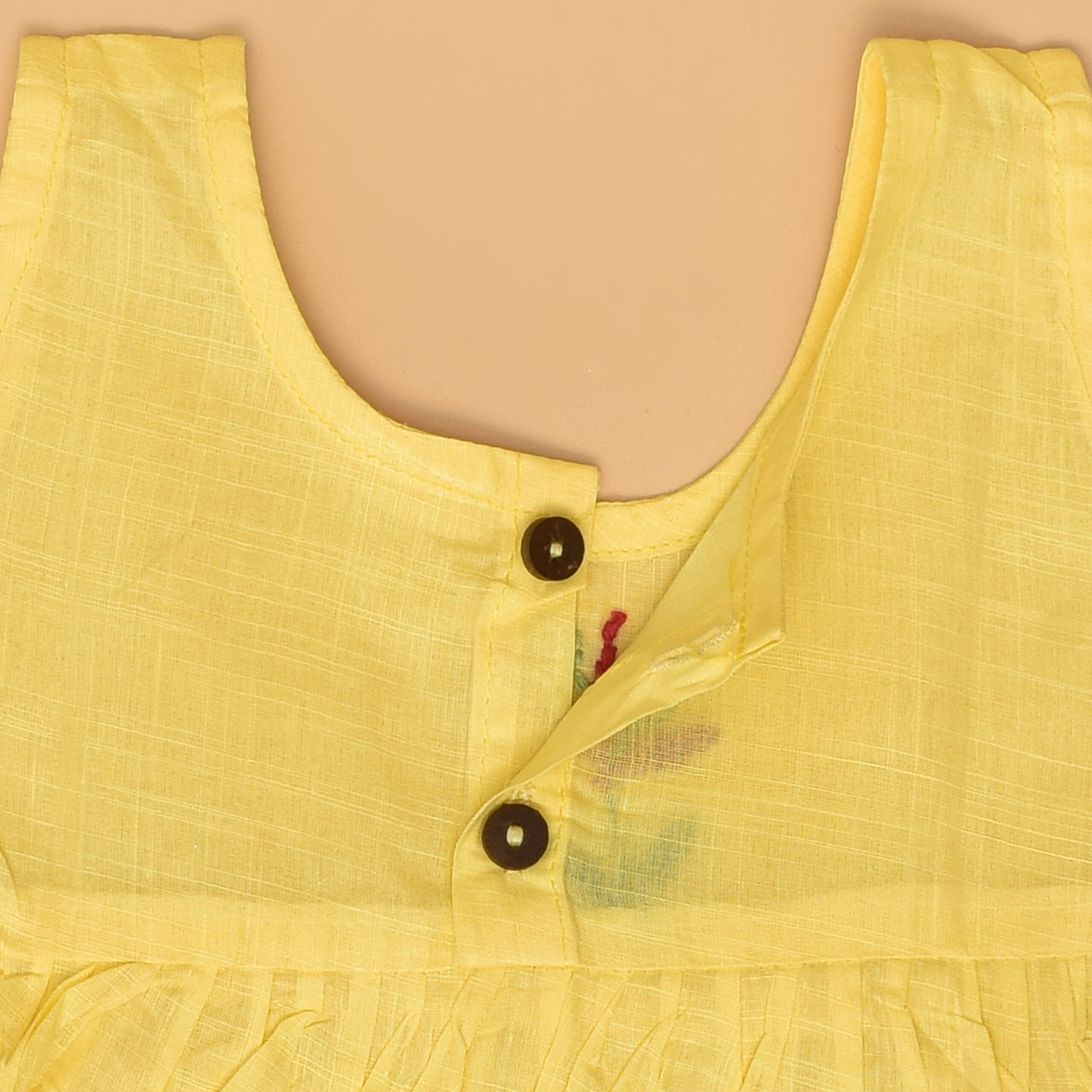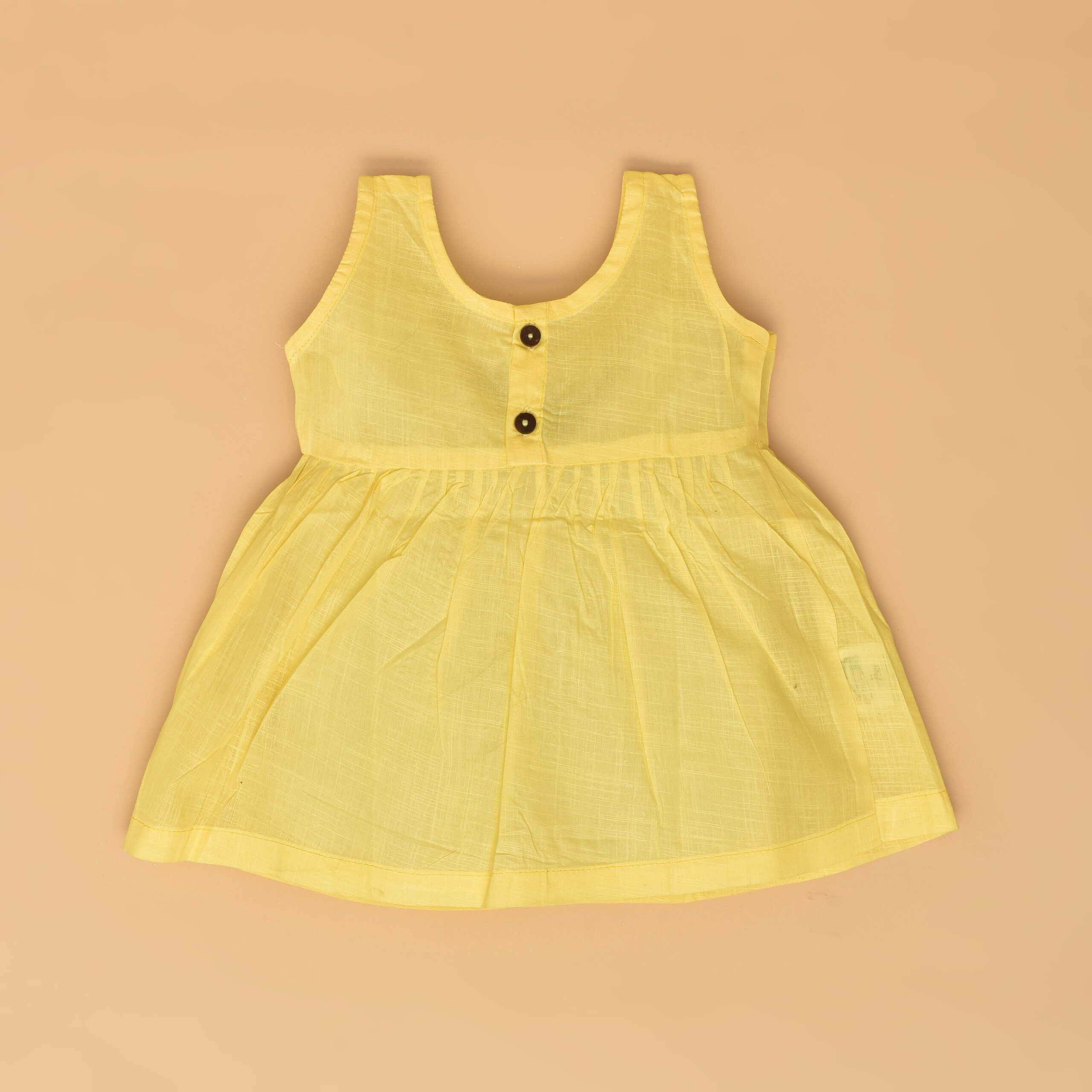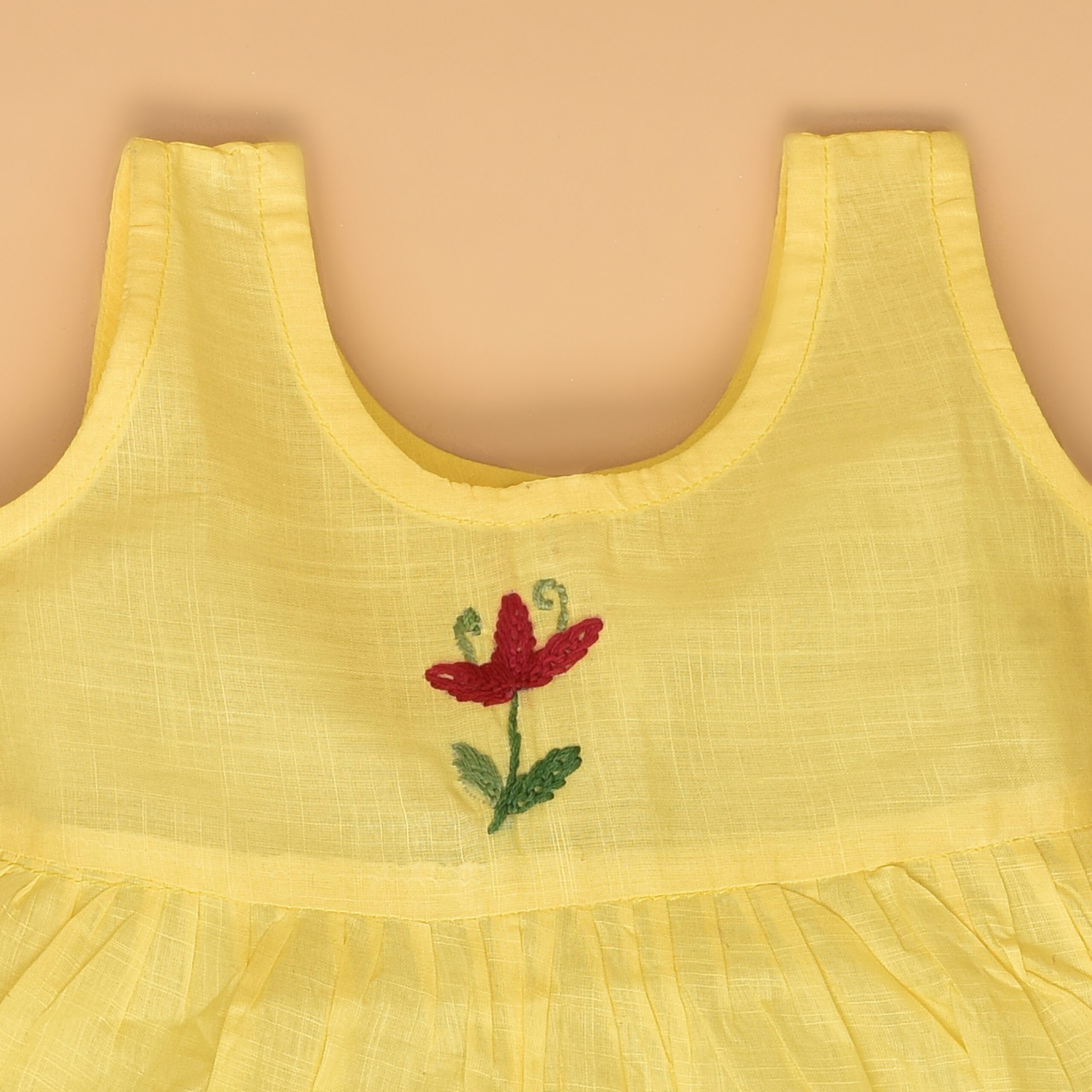 This dress is a delightful blend of comfort and style, perfect for your little one. It features a soft yellow hue, beautifully adorned with delicate hand embroidered periwinkle flower design that adds a touch of whimsy and elegance. Made from breathable cotton fabric, the dress ensures comfort throughout the day. The back-open design with wooden buttons enhances its rustic charm, offering easy wearability. The floral patterns enhance its sweet, playful appeal, making this dress a lovely addition to your baby’s wardrobe.